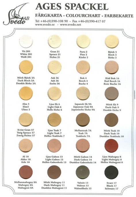 Ages vannbasert svenskprodusert formtre for reparasjon av hull og skader. Produktet kan overflatebehandles med syreherdende lakk, og har minimal nedsynking. Inneholder 400 gram. Fargeplansje