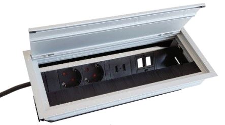 Strømuttak for nedfelling i plate 289,5 x 120mm. 2x 230V og 2x USB. Mer info