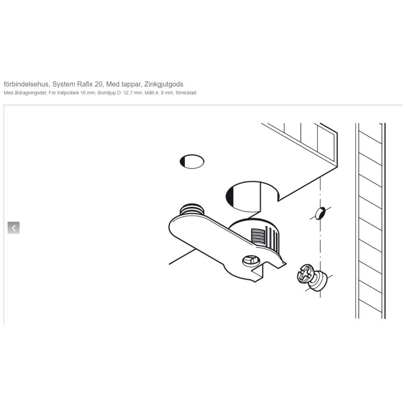 Rafix hus for hull Ø20mm. Bordybde 12,7mm. Leppe med dyvel. Forniklet Zamak. Pris pr. 100 stk. Mer info