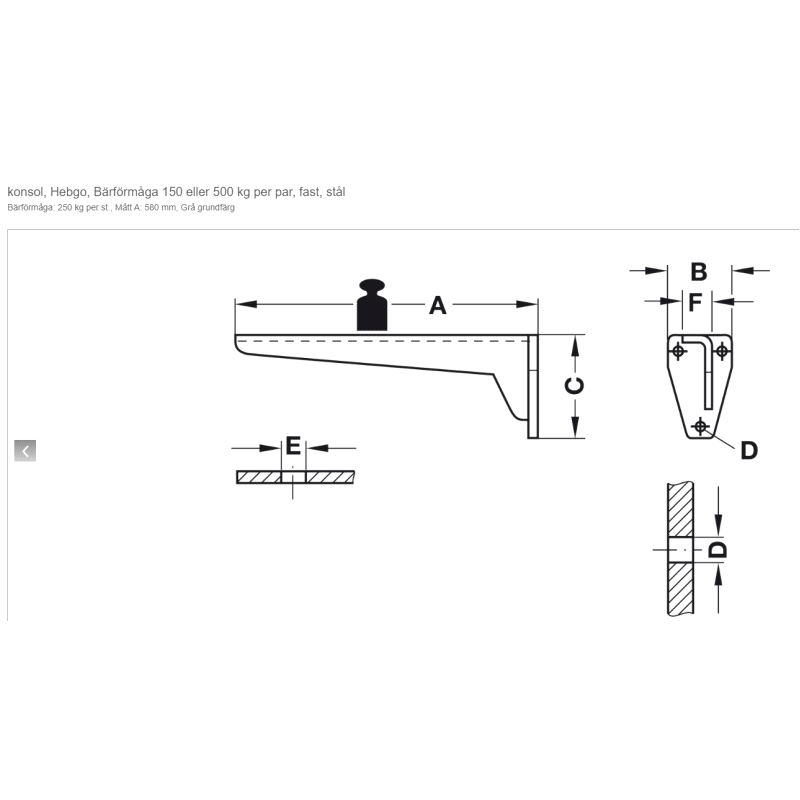 Hyllebrakett 580mm 250kg.