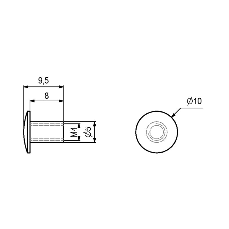 Innvendige M4 gjenger. Hode diameter Ø10mm, for hull Ø5mm. Totallengde 9,5mm. Pris pr. 20 stk.
