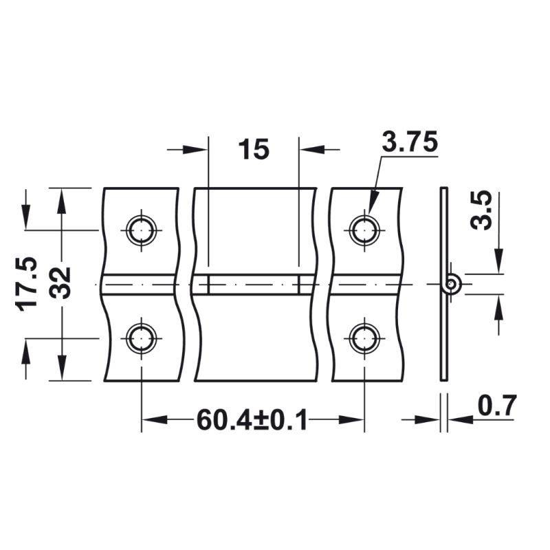 Pianohengsel i Rustfritt stål 1.4016. Lengde 3.500mm, bredde 32mm, tykkelse 0,8mm. Mer info