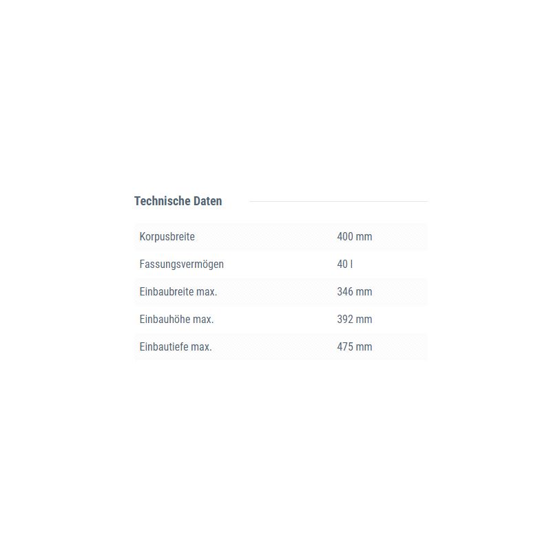 Avfallssystem for 400mm skap. Høyde 327mm, bredde 345mm, dybde 475mm.