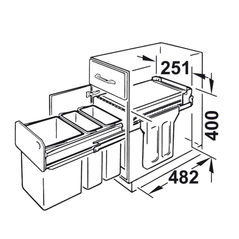 Avfallssystem for 300mm skap. Høyde 400mm, bredde 248mm, dybde 479mm.