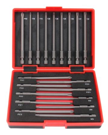 19 deler, sett i rød plasteskeInneholder;Bits 90 mm: Phillips 1 og 2, Pozidriv 1 og 2 og 3.Torx: T10, T15, 3 st, T20, T25, T27 og T30Sekskant; H3, H4 og H5