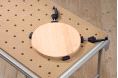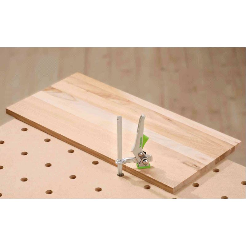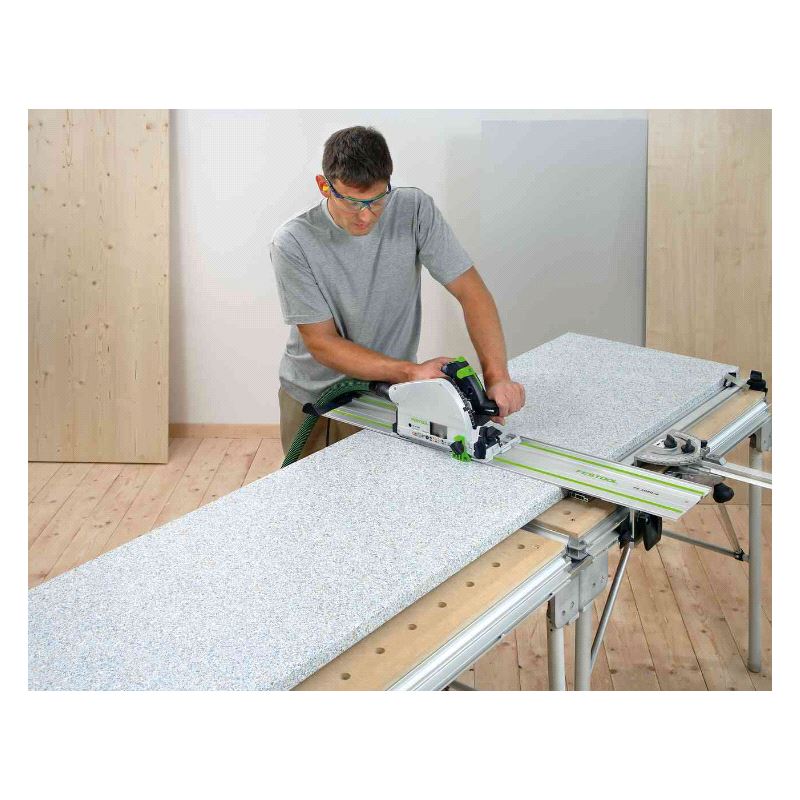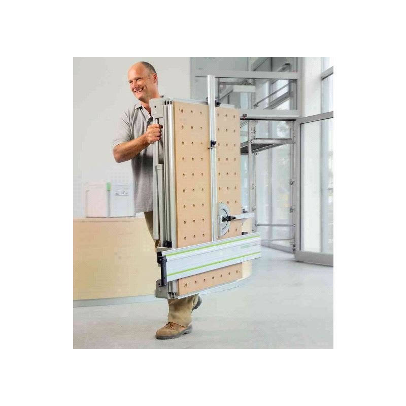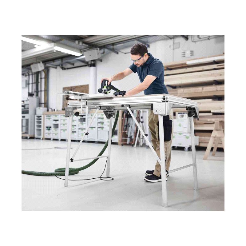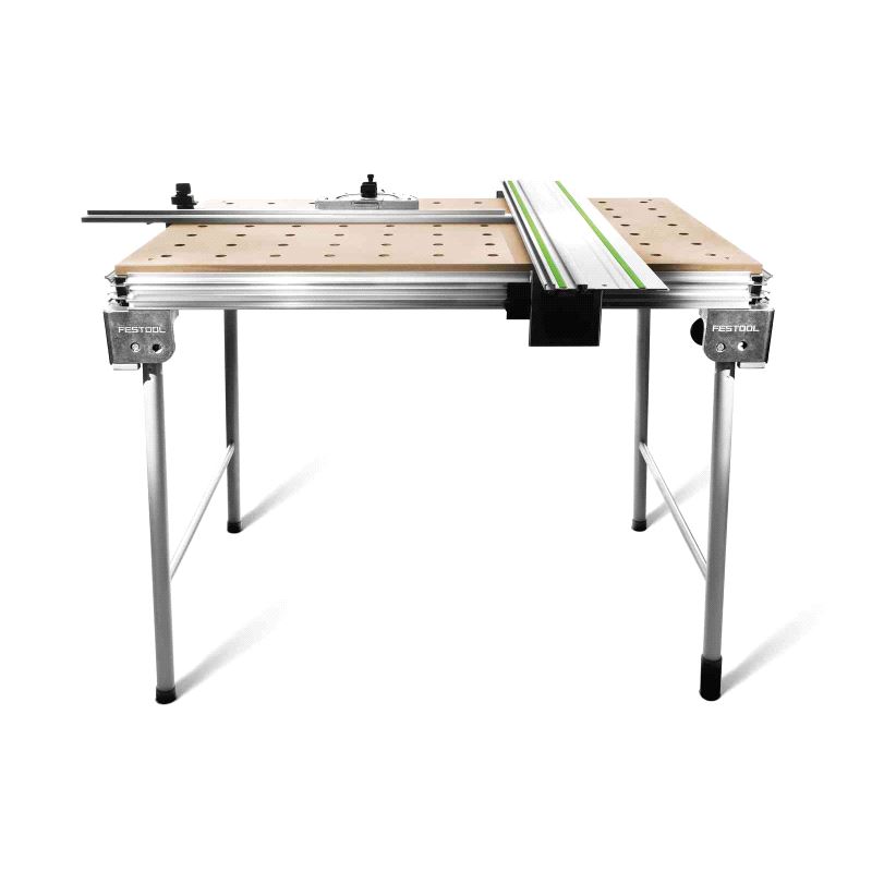 Arbeidsbord med følgende utstyr; Styringsskinne, Vinkelanslag, vippebeslag og anslagsrytter. Bordet har hullplate og klappbare bein.