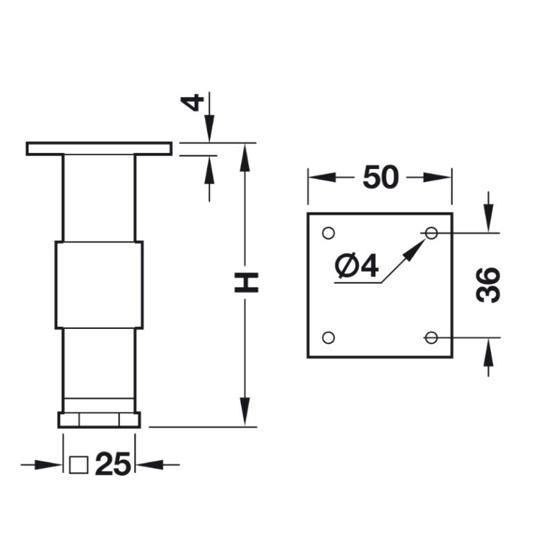 Møbelben Rekt. 80mm Rustfri, høydejusterbar
