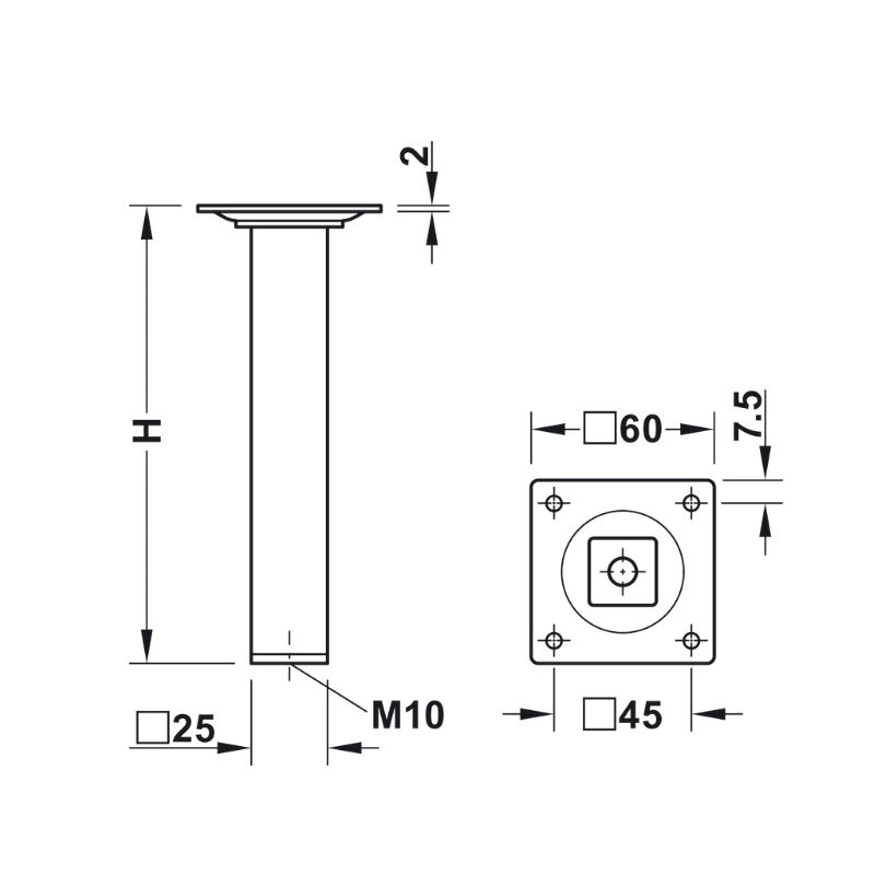 Kvadratisk møbelben 24 x 24mm, høyde 150mm. Plate 60 x 60mm. Mer info HER
