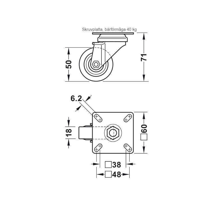 Gummihjul Ø50mm Roterende med plate, uten brems