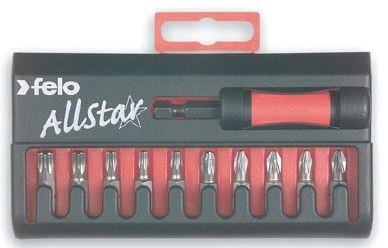 Felo Allstar Bitssett. Selvjusterende Bitsholder med særdeles sterk magnet. Sett består av Holder, 5 stk. Pozidrive bits og 5 stk. Torx bits. Felo art.nr. 020 902 16. Mer info