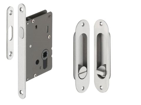 Hakelås for skyvedør, med ovalt låsskilt. Mer info
