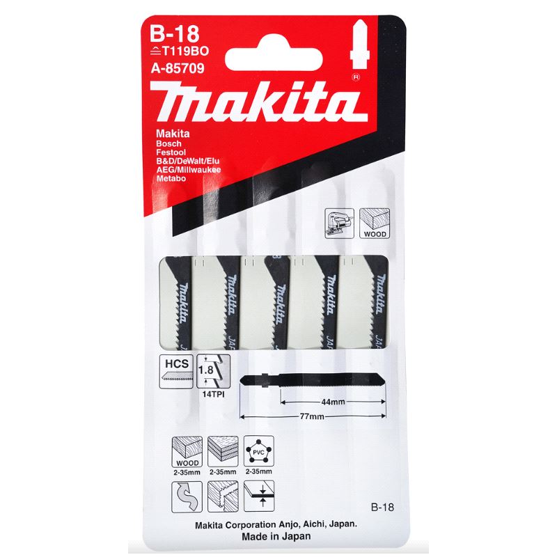 Egnet for materialer som tre og plast. Total lengde 77 mm med en arbeidslengde på 44 mm og 14 TPI. Pakken inneholder 5 blader.