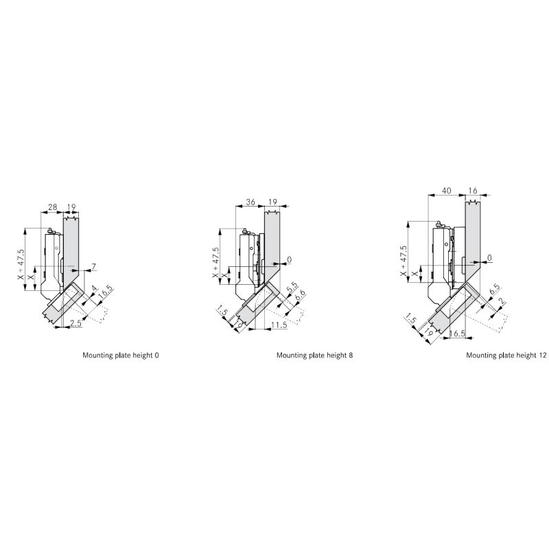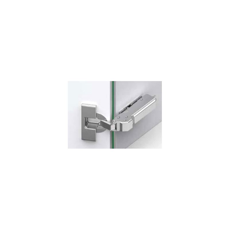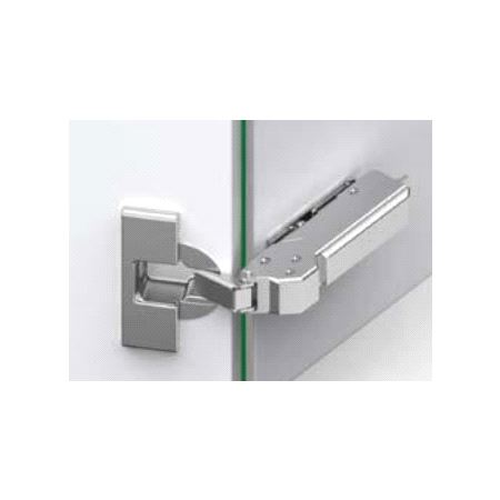 GRASS Tiomos hengsel m/integrert demper for 45° Diagonaldør. 110° åpningsvinkel. Versjon for hurtigmontering med hullbilde 45/9,5mm eller 48/9mm. Max dørtykkelse 24mm. Demperen er justerbar i 3 trinn for tilpasning til ulike dørstørrelser. Velg festeplate