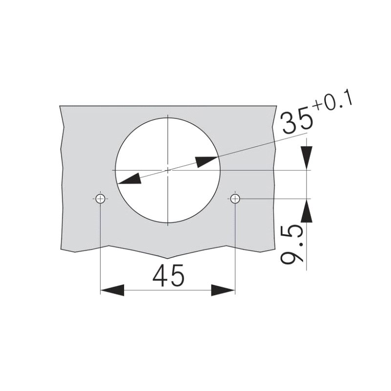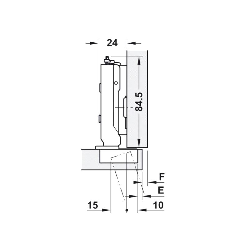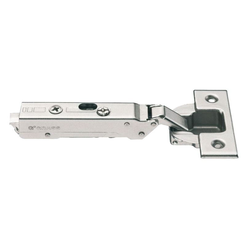 GRASS Tiomos hengsel uten demping for utenpåliggende dør. Versjon for skrumontering med hullbilde 45/9mm. Max dørtykkelse 24mm. Velg festeplate HER.