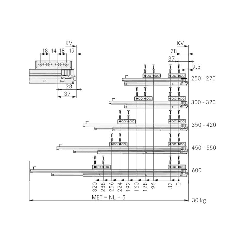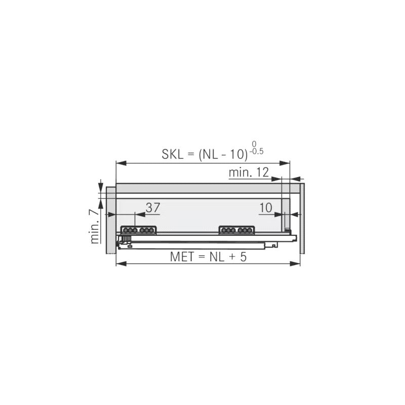 Dynaneo Undermonteringsskinne for treskuff. Bæreevne 30 kg. Fulluttrekk og demping. Maks-tykkelse sidevegger 16mm.
