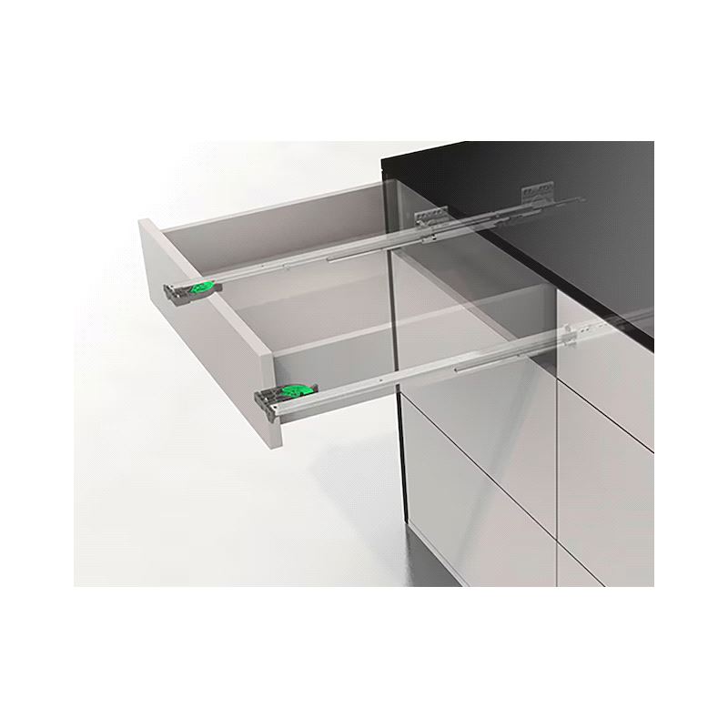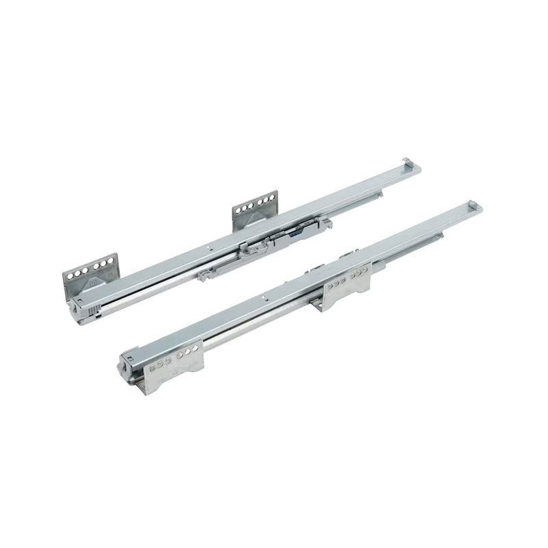 Dynaneo Undermonteringsskinne for treskuff. Bæreevne 30 kg. Fulluttrekk og demping. Maks-tykkelse sidevegger 16mm.