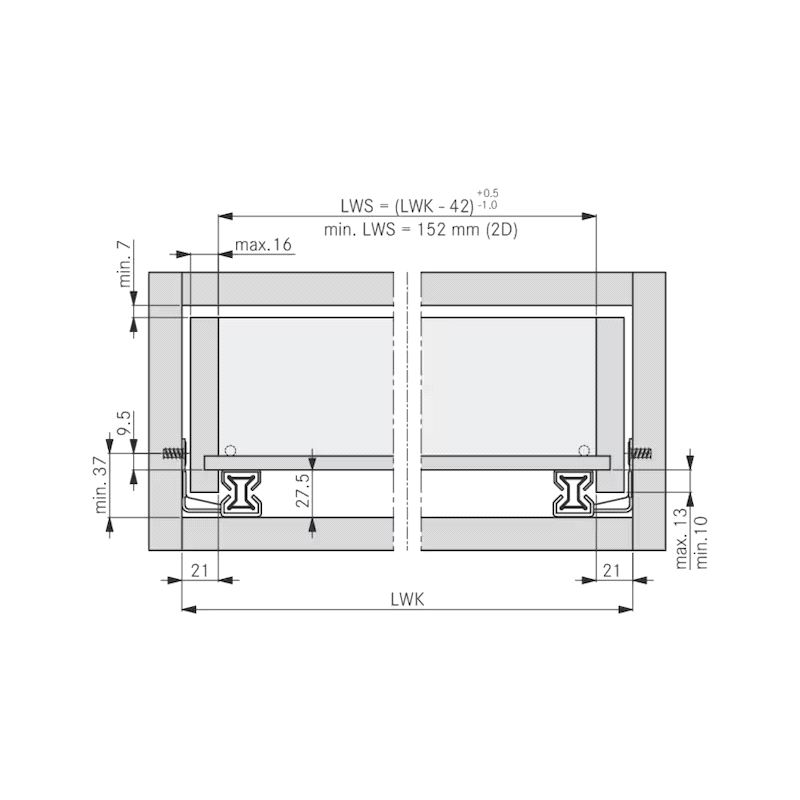 Dynaneo Undermonteringsskinne for treskuff. Bæreevne 30 kg. Fulluttrekk og demping. Maks-tykkelse sidevegger 16mm.