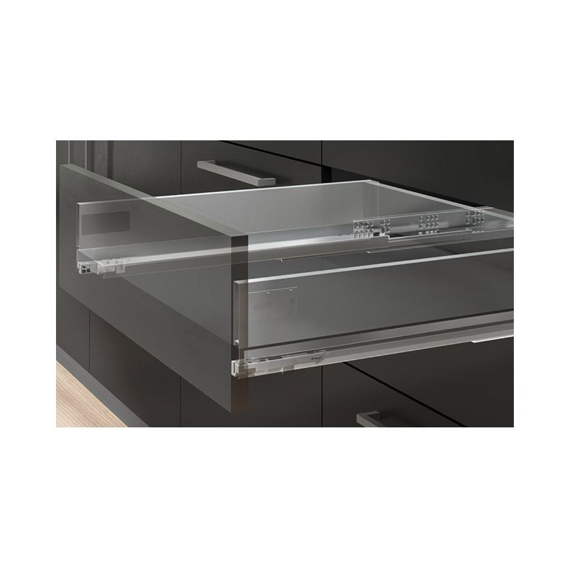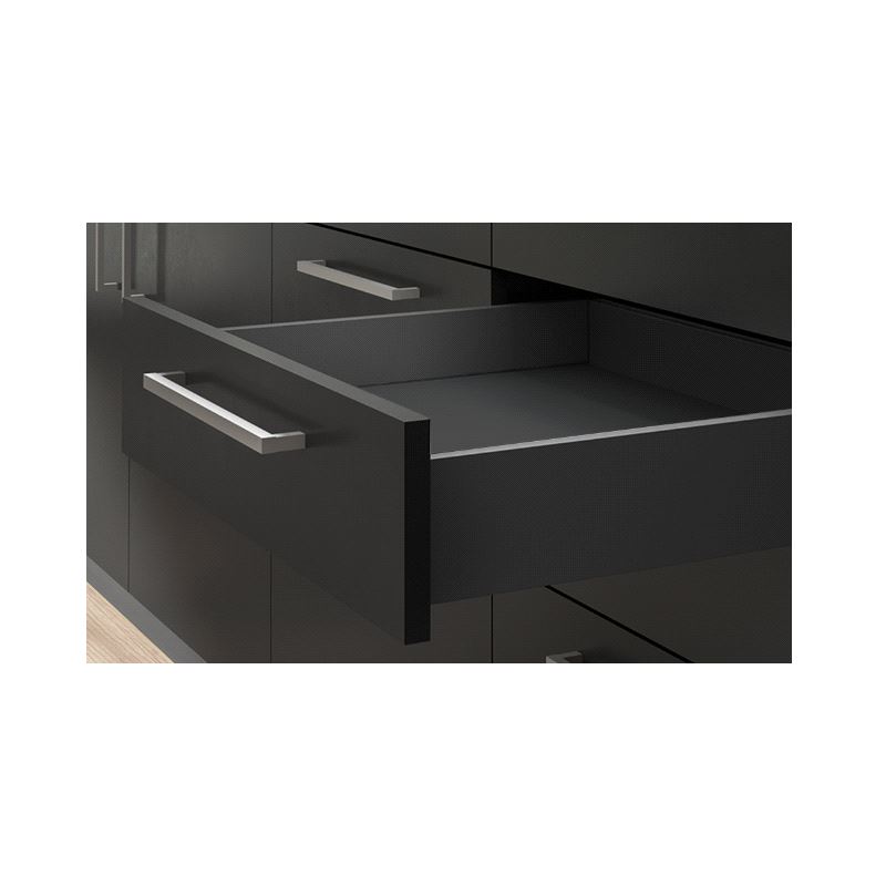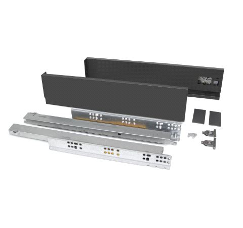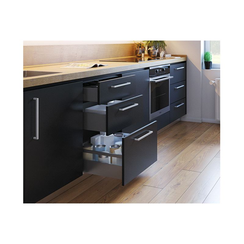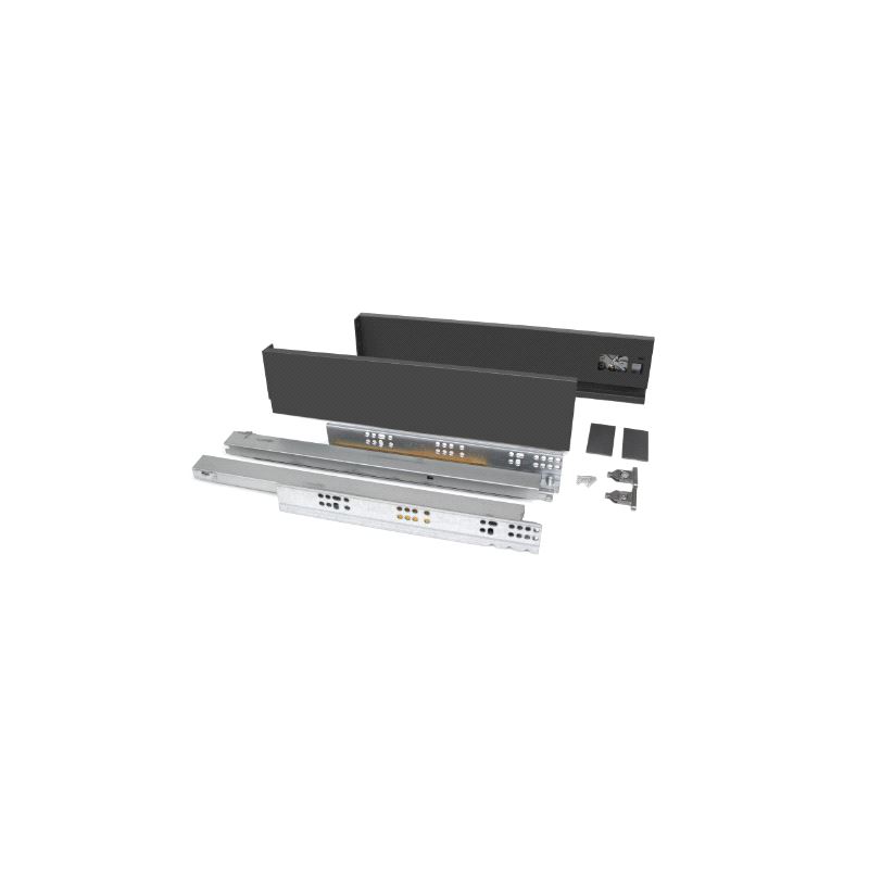 Emuca Vertex Skuffesider og skinner. Sett inneholdende skuffesider, skinner og nødvendige braketter. Bæreevne 40 kg. Fulluttrekk og demping. Tilpasset bruk av materialtykkelse 16mm i bunn og bakstykke. Mer info