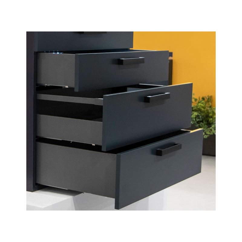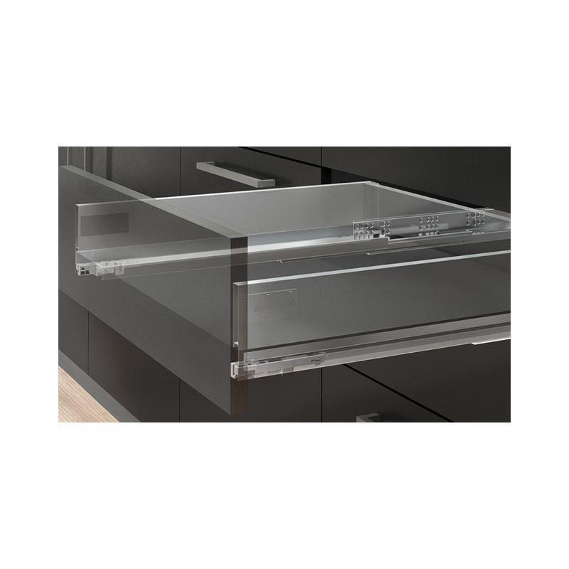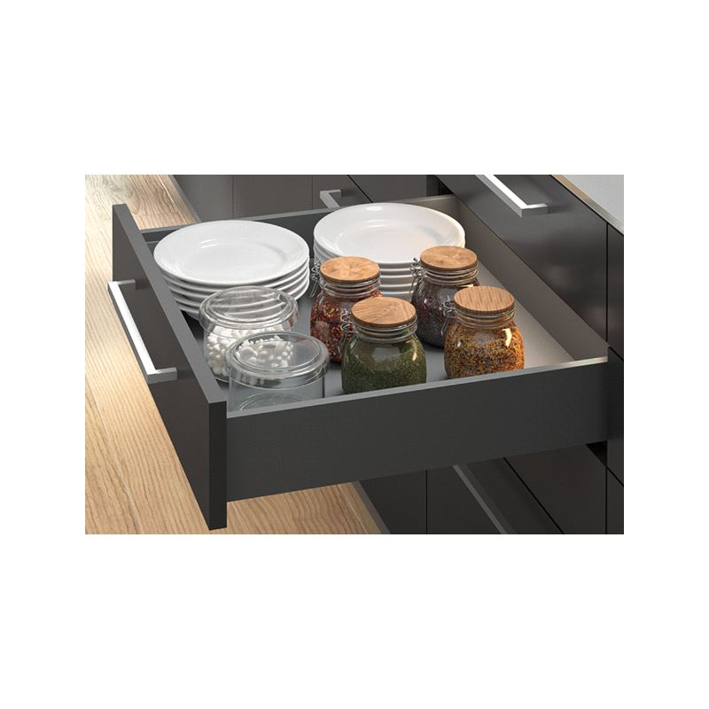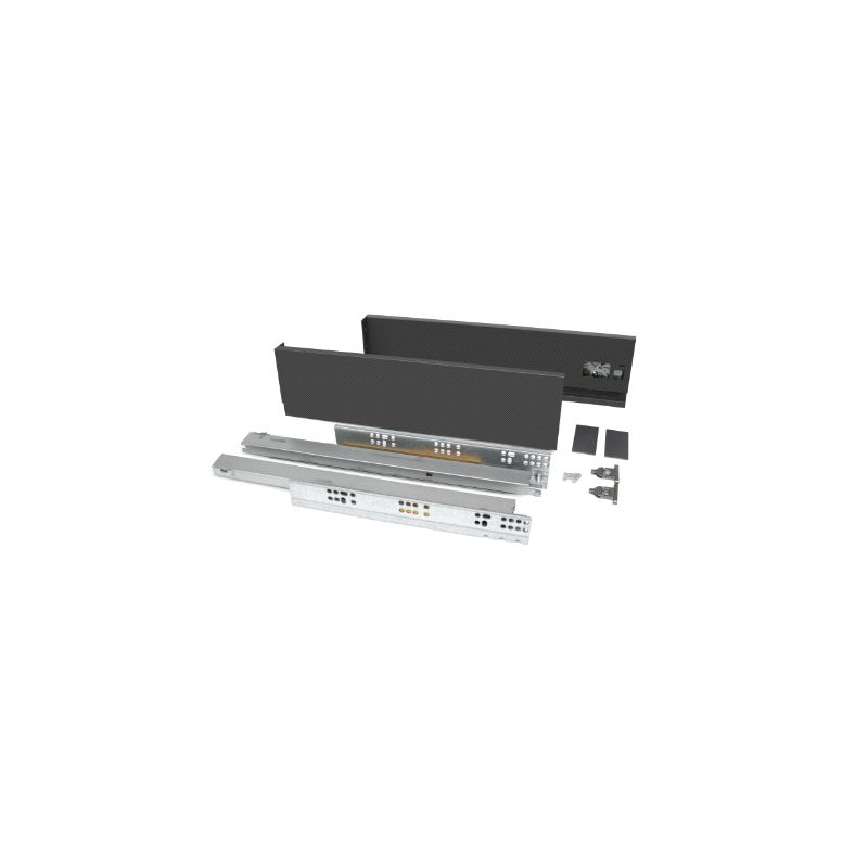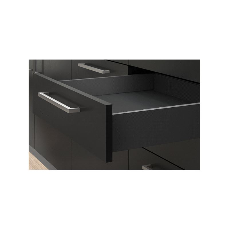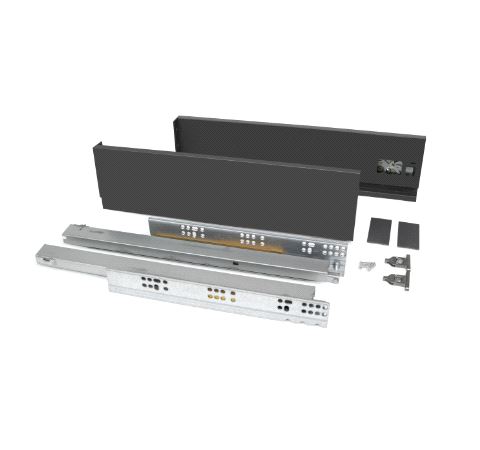 Emuca Vertex Skuffesider og skinner. Sett inneholdende skuffesider, skinner og nødvendige braketter. Bæreevne 40 kg. Fulluttrekk og demping. Tilpasset bruk av materialtykkelse 16mm i bunn og bakstykke. Mer info