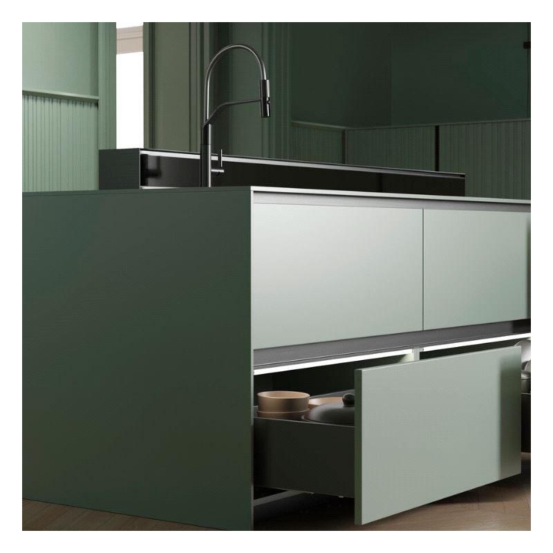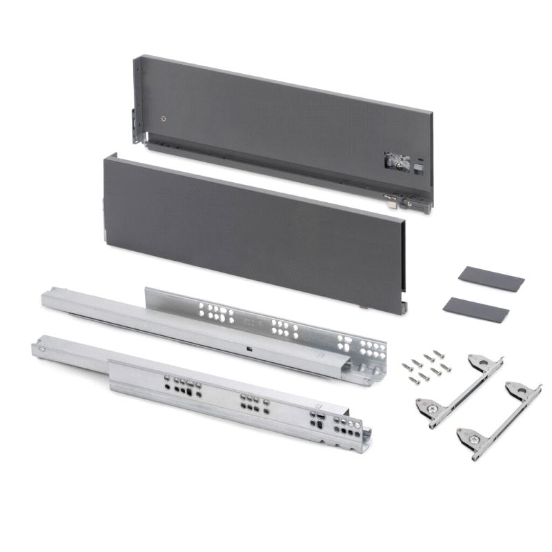 Emuca Vertex Skuffesider og skinner. Sett inneholdende skuffesider, skinner og nødvendige braketter. Bæreevne 40 kg. Fulluttrekk og demping. Tilpasset bruk av materialtykkelse 16mm i bunn og bakstykke. Mer info