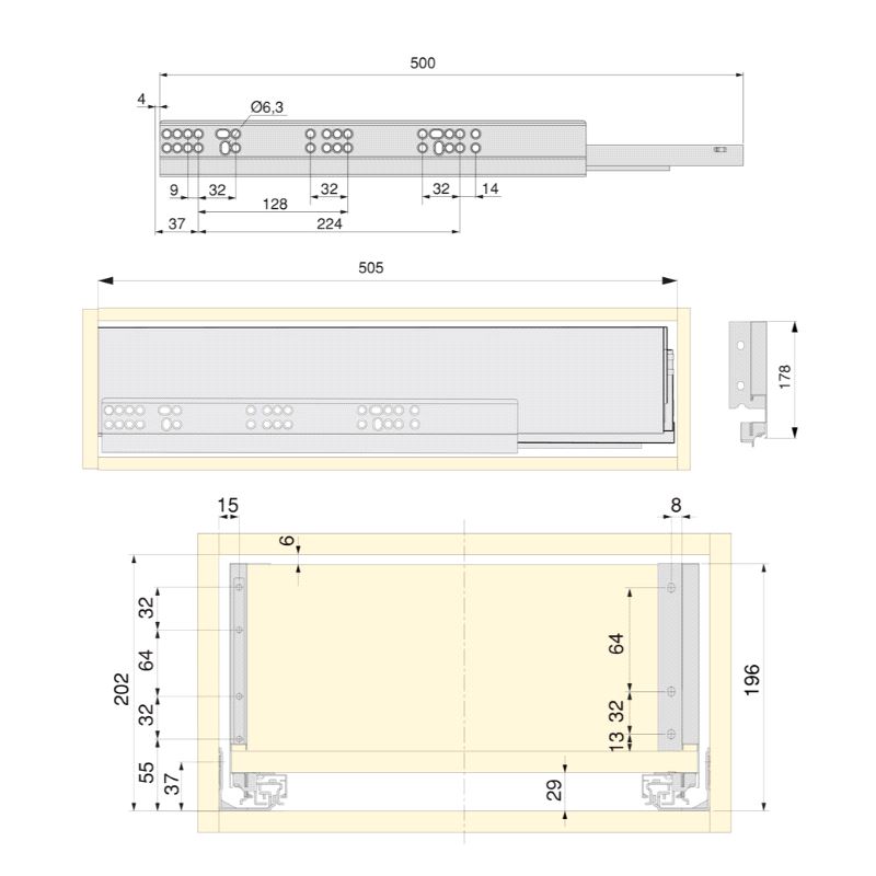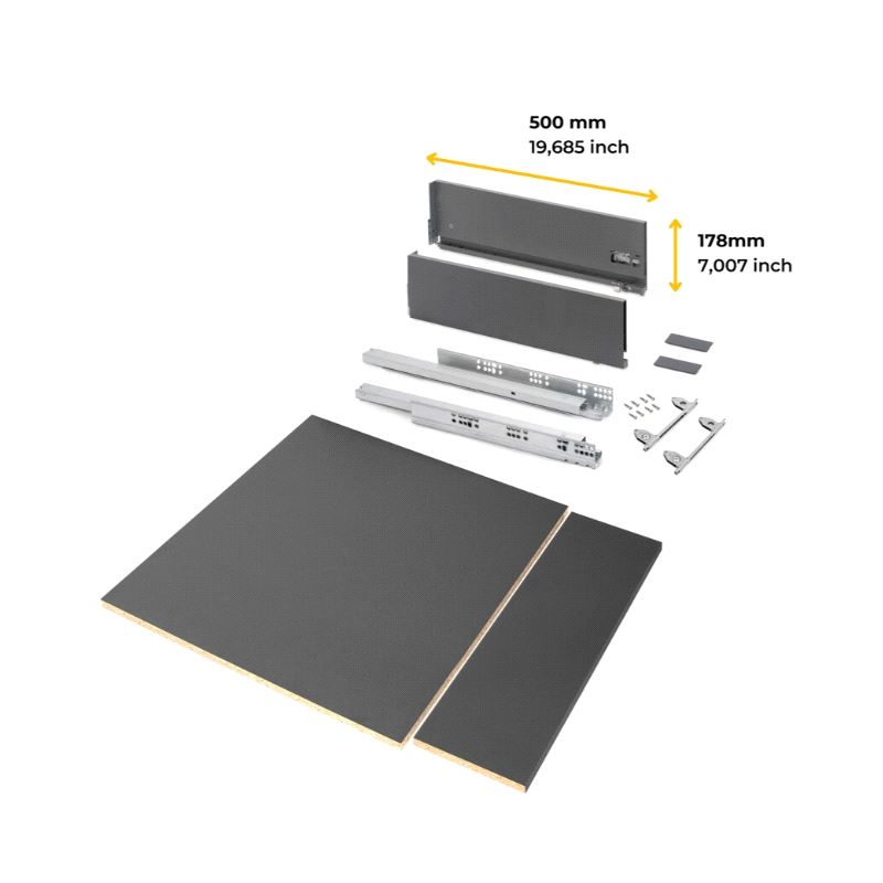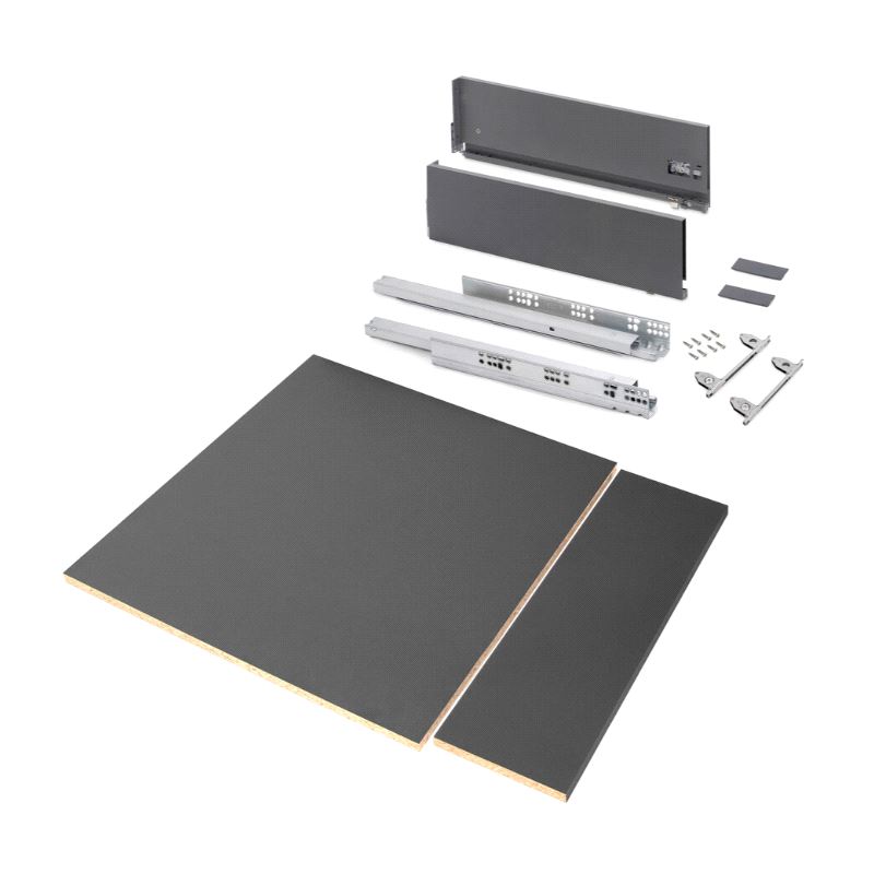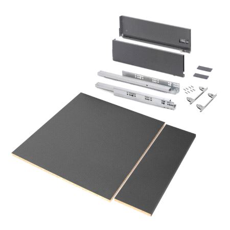 Emuca Vertex Komplettskuff. Sett inneholdende skuffesider, skinner, bunn og bakstykke for skrogseksjon med utvendig bredde 600mm. Bunn og bakstykke har tykkelse 16mm og kan kappes og tilpasses smalere skrog. Bæreevne 40 kg. Fulluttrekk og demping. Mer info