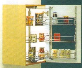 Kurvhyllesystem for kjøkken overskap med 30cm. utvendig bredde, bestående av 3 + 3 Chrome hyller, rammeverk og skinne som gjør at de 3 innerste hyllene kommer frem i skapet når man åpner døren. Høyde innvendig i skapet må være i området 640 - 740mm. og dybden må være min. 280mm.