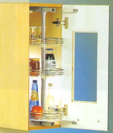 Karusell for kjøkken overskap med 30cm. utvendig bredde. Skinneløsning som gjør at hyllene kommer frem av skapet når døren åpnes. Max innvendig skaphøyde 690mm, minimum skapdybde 280mm